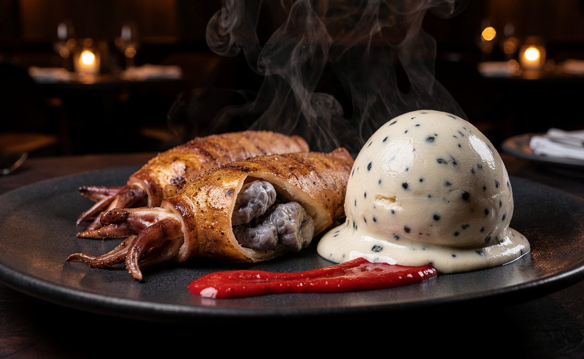 - Servez les encornés chauds avec une boule de glace à la vanille bourbon et un peu de sauce tomate maison.